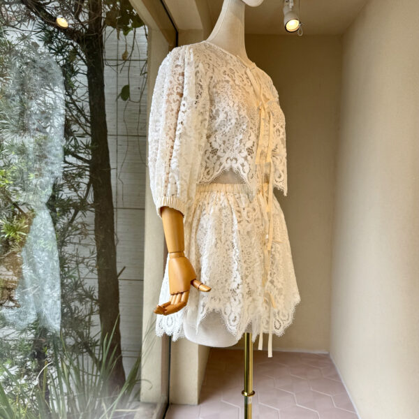 A blusa em tecido acetinado no tom rose traz um toque de delicadeza. O modelo apresenta uma fenda frontal que adiciona sutileza ao design, enquanto o maxi laço de organza no ombro se destaca como o grande protagonista da peça, criando um visual cheio de charme.