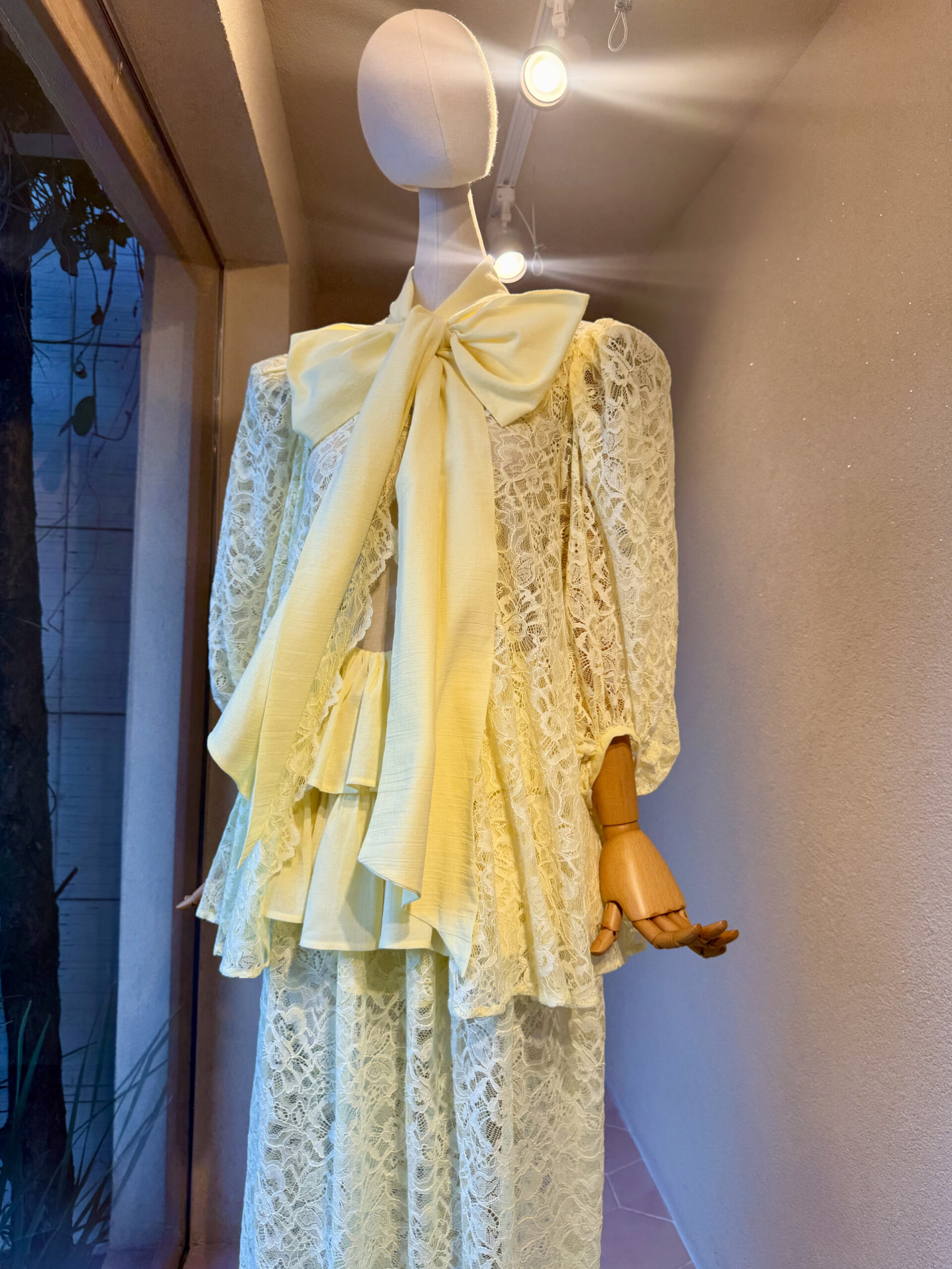 O camisão Melia foi confeccionado em renda na cor celestial yellow, com uma gola em faixa, que pode ser amarrada em um laço, acrescentando um toque feminino. As ombreiras e as mangas amplas trazem estrutura, equilibrando romantismo e presença.