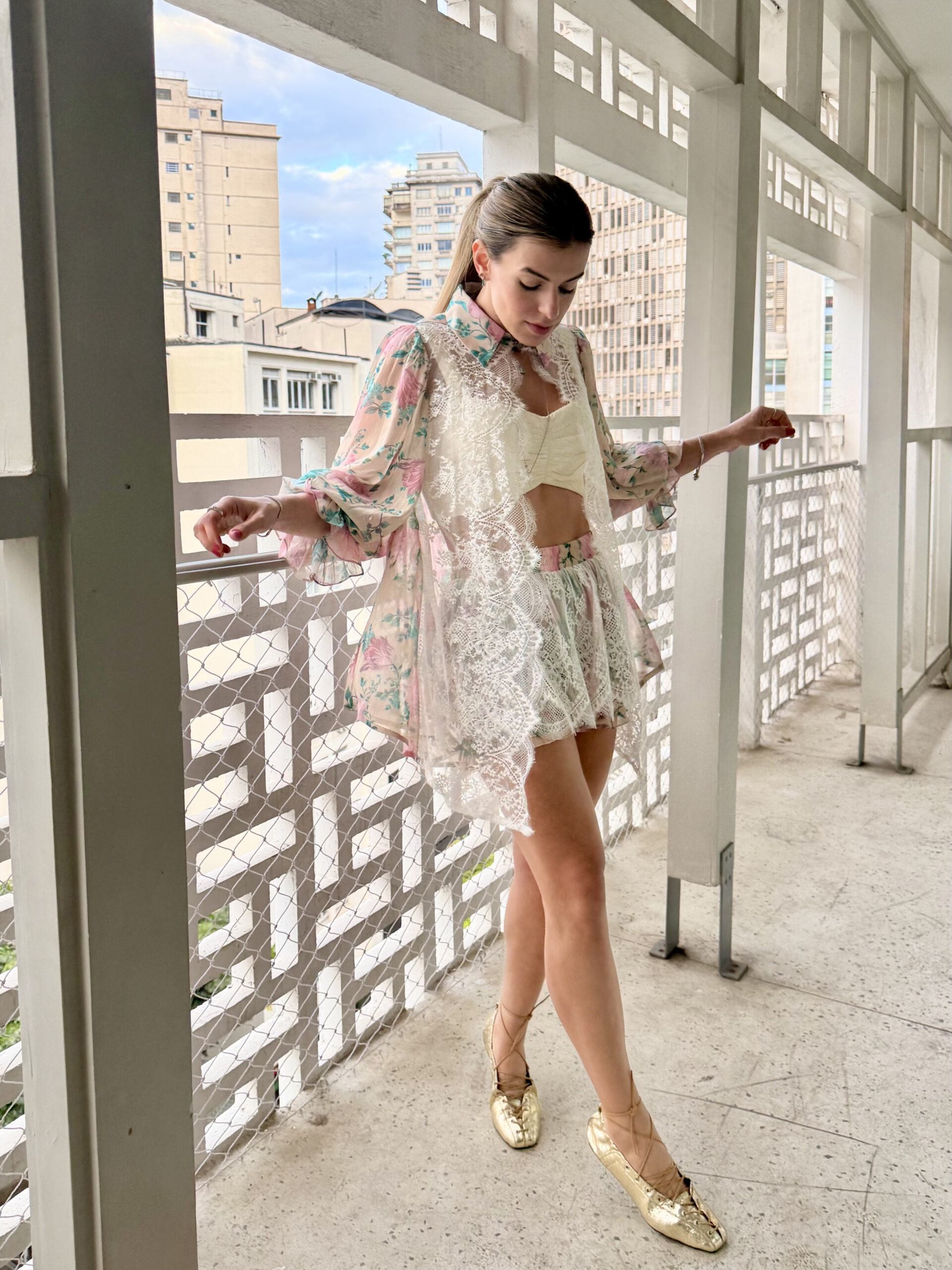 O short saia Alice foi confeccionado em tecido fluido com estampa floral na tonalidade cream, proporcionando leveza e movimento ao visual. Possui elástico na barra, garantindo conforto e ajuste. A parte da saia em renda na cor off-white adiciona delicadeza e um toque artesanal, tornando a peça romântica e cheia de charme.