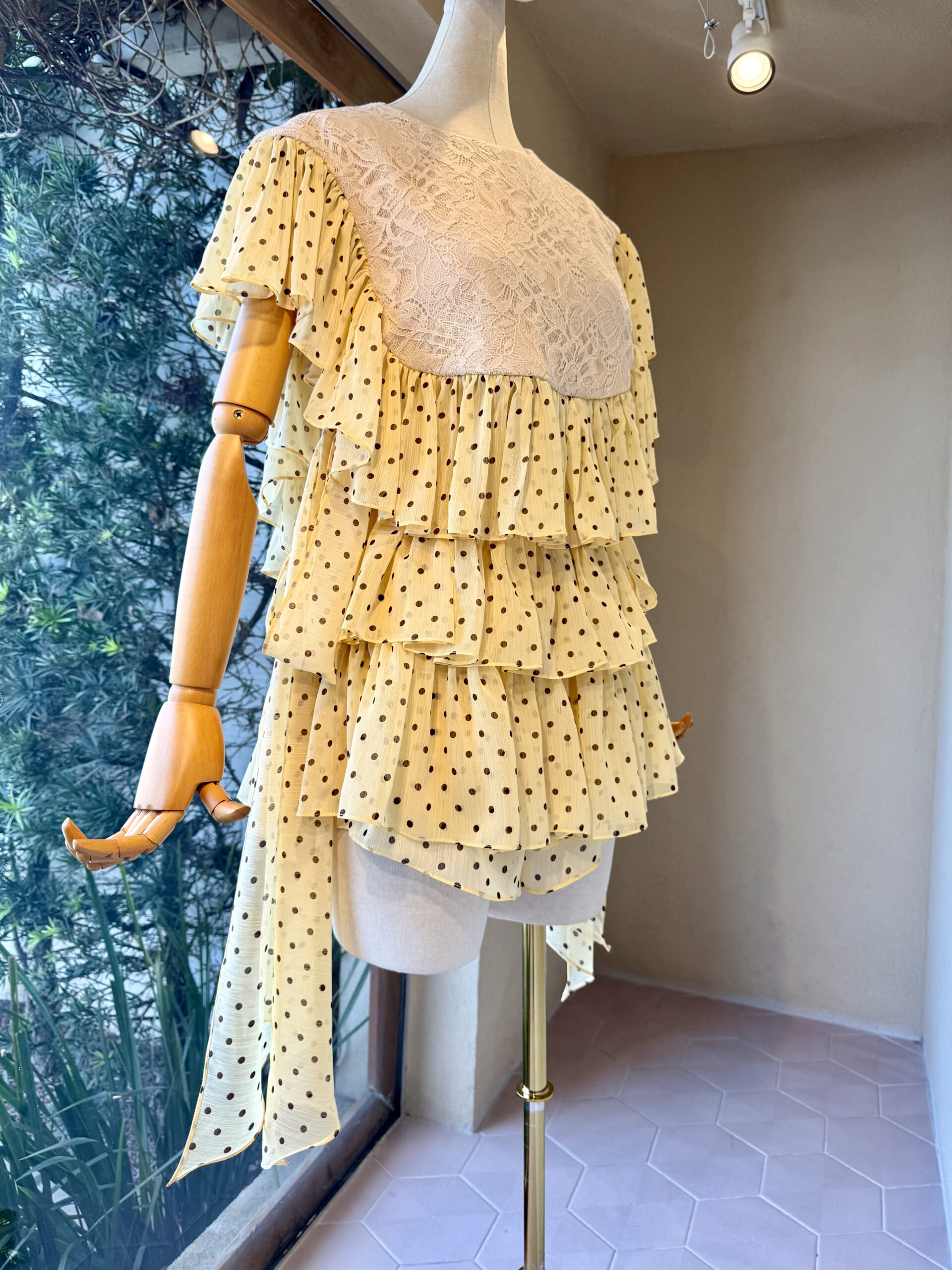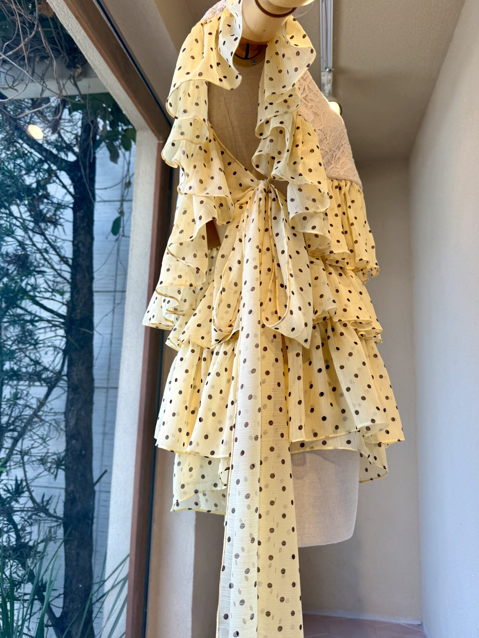 O top Aletheia possui uma pala de renda, que traz um toque artesanal e romântico, enquanto os babados em tecido fluido na cor vanilla lee adicionam leveza e movimento. A amarração em laço na lateral completa o design com graciosidade e permite um ajuste delicado à silhueta.