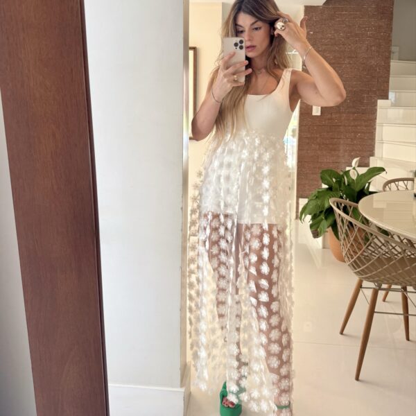 O top Lêda combina delicadeza e leveza em uma peça única. Confeccionado em malha com sobreposição de tecido transparente, apresenta aplicações de flores 3D que adicionam textura e um toque artesanal, resultando em um visual romântico e sofisticado.