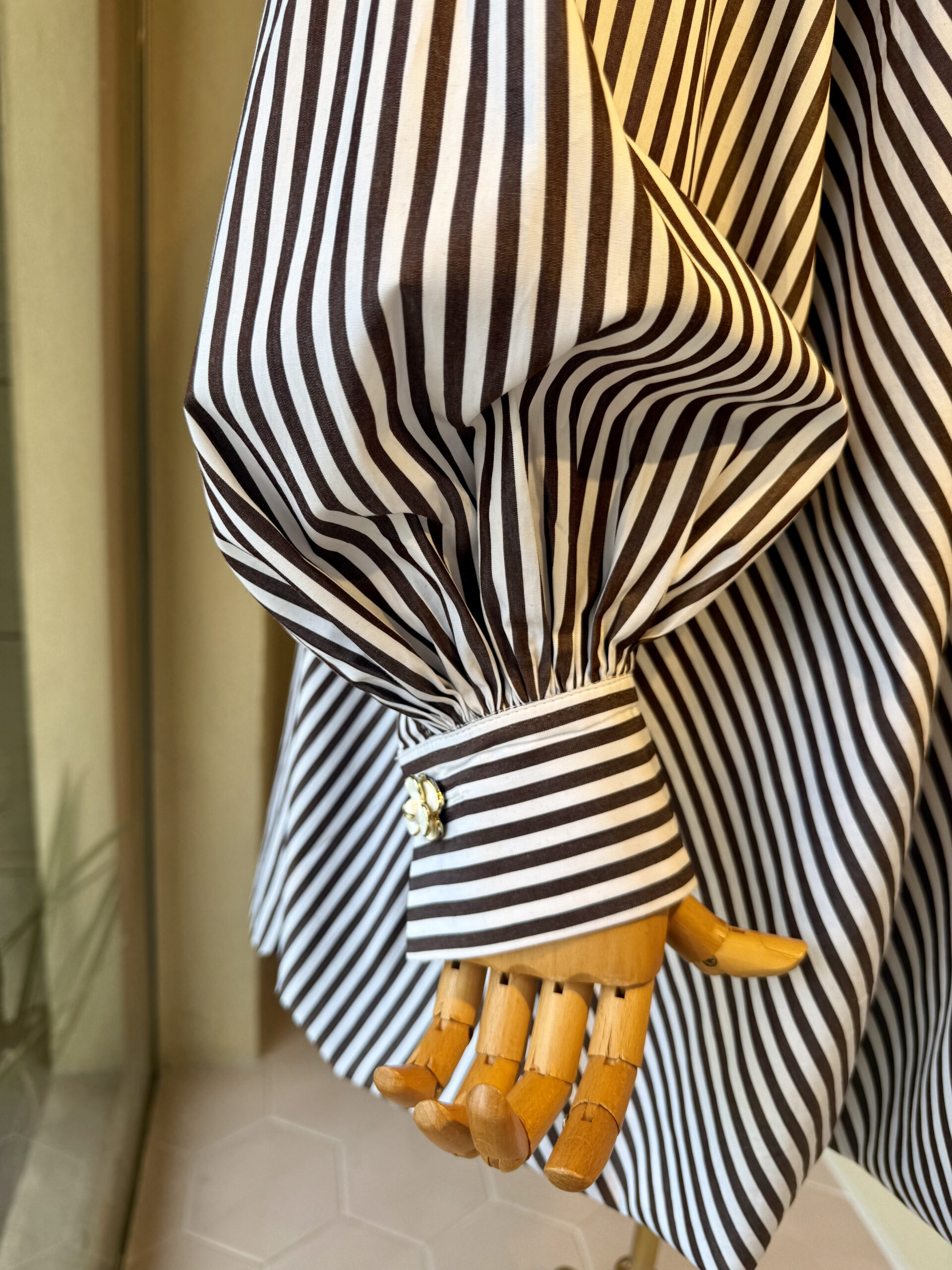O vestido Catarina foi confeccionado em tecido listrado nas cores coffee e off-white, que traz um ar clássico e atemporal. Com modelagem balonê e mangas franzidas no punho, ele une volume e feminilidade na medida certa. Acompanha uma faixa com elástico, que permite formar um laço, adicionando um toque romântico ao visual.